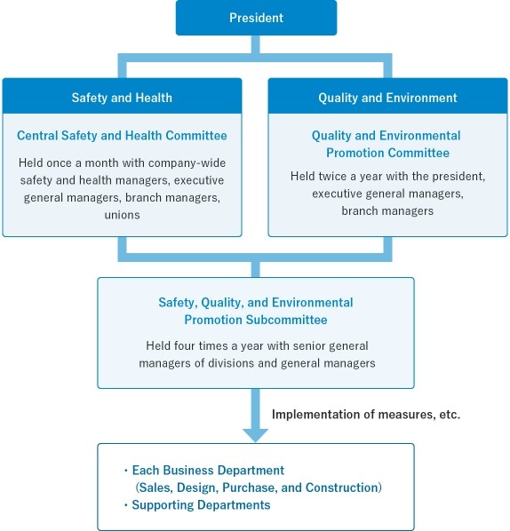 Safety, Quality, and the Environment are of the utmost importance and closely related to each other, and we have therefore built an integrated management system. The Central Safety and Health Committee and the Quality and Environmental Promotion Committee, both of which are led by the President, are responsible for discussing reports and implementation issues. The details of these discussions are communicated to all employees via the Safety, Quality, and Environmental Promotion Subcommittee.
