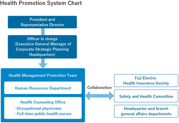 We believe that employee health is essential to our businesses, and have therefore created a system to support the improvement of employee health in which a health management promotion team—comprising the Human Resources Department, occupational physicians, and full-time public health nurses—works alongside health insurance societies, the Safety and Health Committee, and other organizations. We have also set up the Health Counseling Office, which is responsible for following up on the results of medical examinations and promoting the improvement of employee health through various other systems and initiatives.